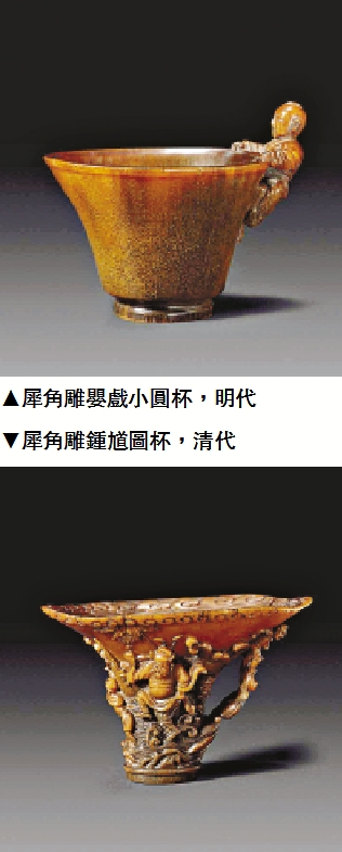 犀角器是以犀牛角為原料雕刻的器物。相傳用犀角杯飲酒可清熱解毒,所以,它便成為犀角器的主要器形。專家介紹,早在漢代,即有用犀角作裝飾及飲酒器具。經過千百年發展,犀角雕刻也成為中國古代工藝美術的重要品類,在明清時期達到巔峰。
