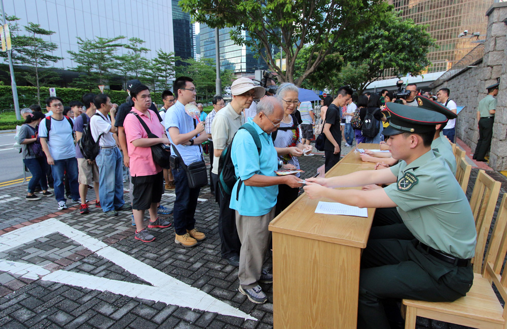 解放軍駐港部隊昨日早上八時三十分開始,分別在中環軍營、九龍東軍營、槍會山軍營、石崗軍營、新圍軍營和潭尾軍營派發門票,市民可憑身份證領取最多四張門票,共派發昂船洲軍營門票一萬張,石崗軍營則八千張。