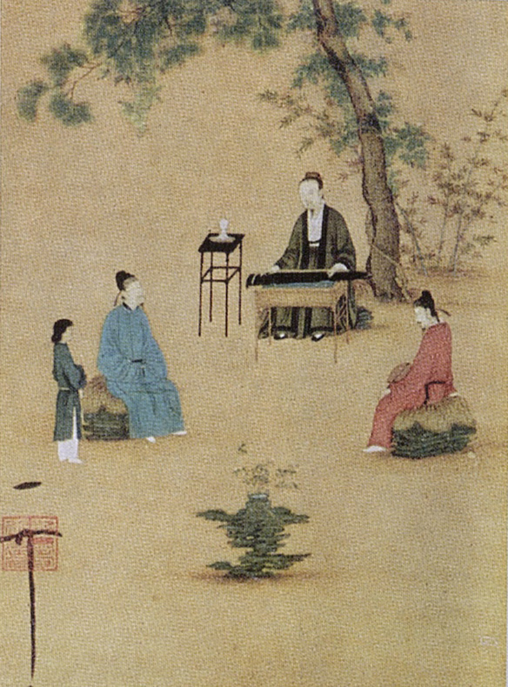 附圖為宋徽宗親筆所繪的代表作《聽琴圖》(局部),人物細致,技法工巧,絲毫不苟,可窺見其院體畫風格一斑。