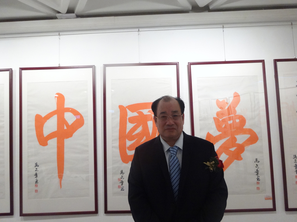 圖:河南省書法家馬文章,其身後作品為《共圓中國夢》(局部) 大公報記者劉毅攝