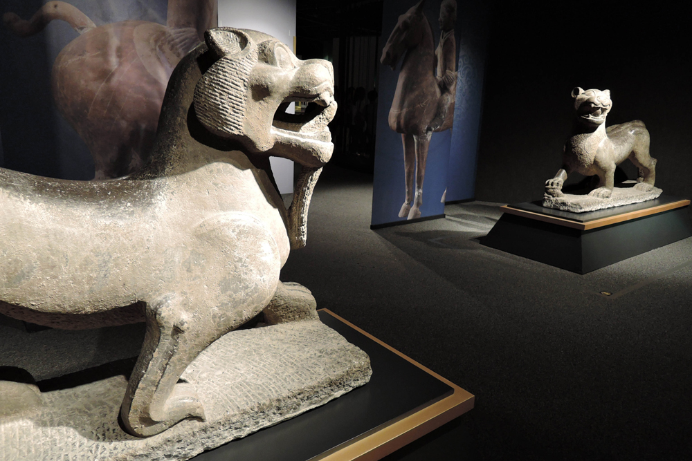 在香港歷史博物館的「漢武盛世」展覽,展廳門口擺放由西安碑林博物館借出的辟邪和天祿石雕,它們昂首張口,蓄勢待發。乍看之下,兩獸形貌相似,但右邊的天祿下頷有一縷卷鬚,而其他地方所見的漢代辟邪和天祿,身上還有翅膀,這些造型與近東的神獸雕刻相似,可見當時中國已受異域風氣影響。