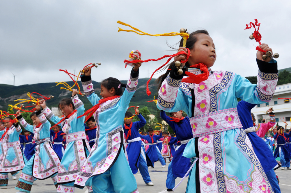 鼓點鏗鏘,銅鈴悅耳。隨?鼓點與銅鈴節奏,舞者翩翩起舞,時而萬馬奔騰,時而急雨過川─這就是被列入第一批國家級非物質文化遺產名錄的彝族「鈴鐺舞」。目前,在貴州省威寧彝族回族苗族自治縣,彝族「鈴鐺舞」已走入當地的中小學校,被列入部分校園的「大課間操」進行傳承。圖為7月1日,貴州省威寧縣板底鄉板底小學的學生在歡快地表演彝族「鈴鐺舞」。 新華社