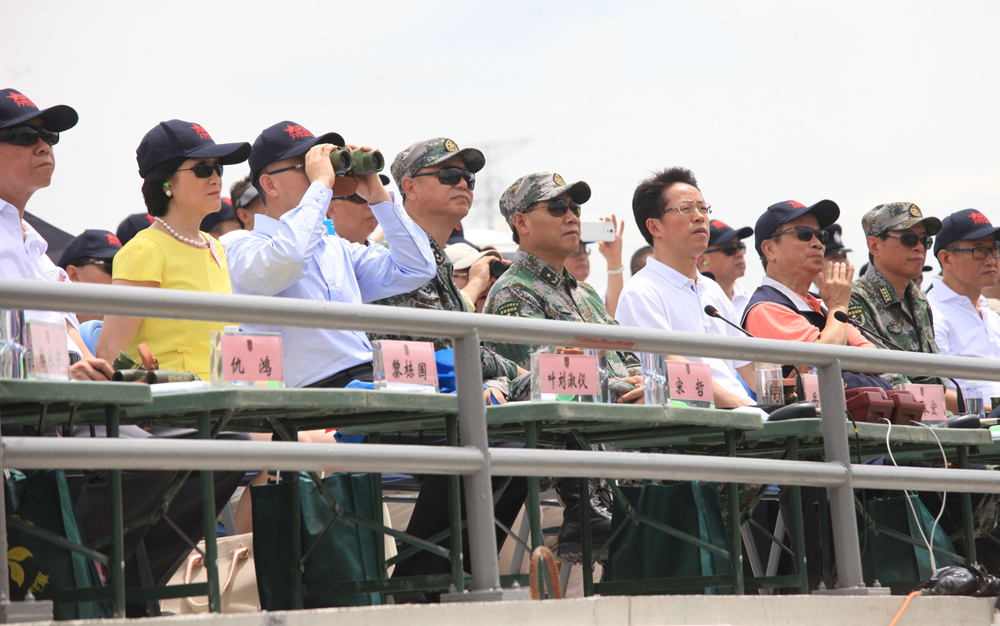 圖:駐港部隊司令員譚本宏(左五)陪同中聯辦主任張曉明(右四)、外交部駐港特派員宋哲(左三)等嘉賓在現場觀摩\大公報記者蔡文豪攝