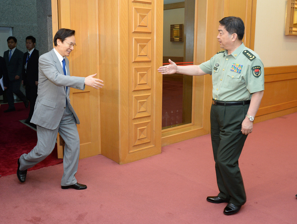 圖:中國國防部長常萬全17日在北京會見日本國家安全保障局長谷內正太郎/中新社