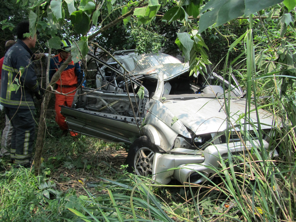 苗栗縣消防局中午近12時接獲通報,「國道」3號南下130.8公里處,發生車禍意外,隨即派出後龍分隊前往查看,發現1部銀色房車從高架道路,翻落深21.9米約10層樓高地面,車體幾乎變成廢鐵。