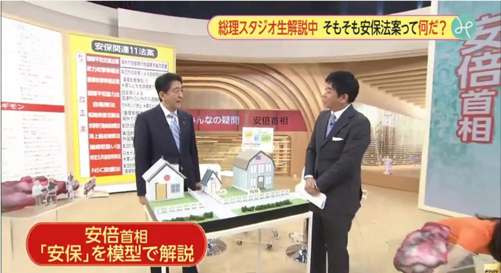 20日的富士電視台節目《大家的新聞》中,安倍親身上陣,試圖安撫民眾對於新安保法將解禁集體自衛權、使日本捲入戰爭漩渦的疑慮。