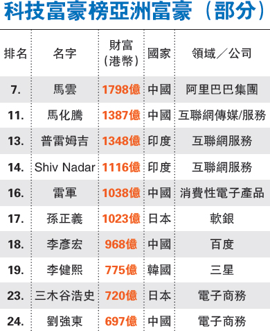 馬雲就以232億美元的財富排行全球第七,是亞洲科技首富。騰訊主席馬化騰排行亞洲第二,全球排名第11。小米創辦人雷軍以134億美元的財富,排行全球第16,身家超越三星集團主席李健熙的100億美元。香港藍思科技股份有限公司董事長周群飛也榜上有名,以75億美元財富排第30位。