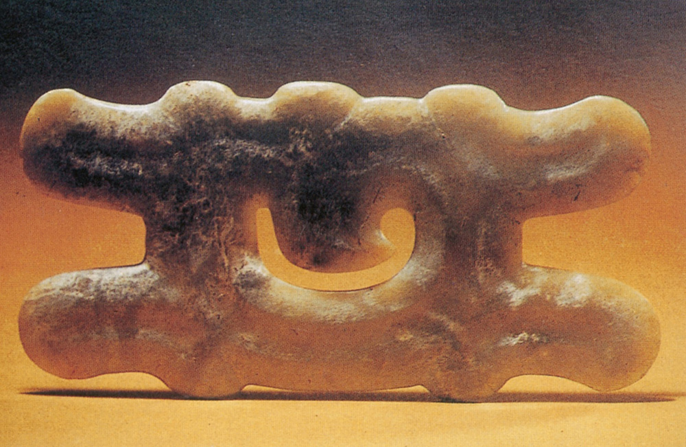 對我國高古玉器有研究的同好者,皆甚重視新石器時代紅山文化玉器;除了著石的玉鴞、玉獸形玦、玉聯環和玉馬蹄形器外,尚有一種原始形制,十分特別,就是附圖的玉勾雲形器,但與玉勾形器不同。後者片狀,似刀形,鋒部稍彎似有勾,邊部薄有緩坡;應為懸掛身上佩飾。勾雲形器於五千五百多年前紅山文化遺址中多次發現,形狀古怪獨特;到底是佩飾,抑或屬禮器,迄今尚無定論,但卻成為紅山文化一大標誌。
