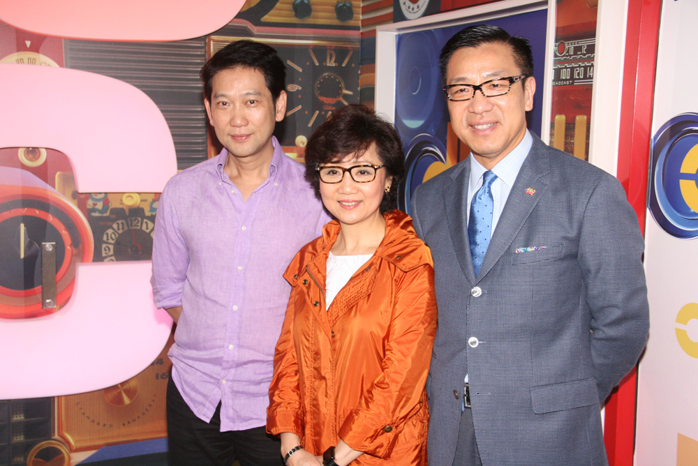 圖:張德蘭(中)偕丈夫楊偉誠(右)與楊立門到電台宣傳