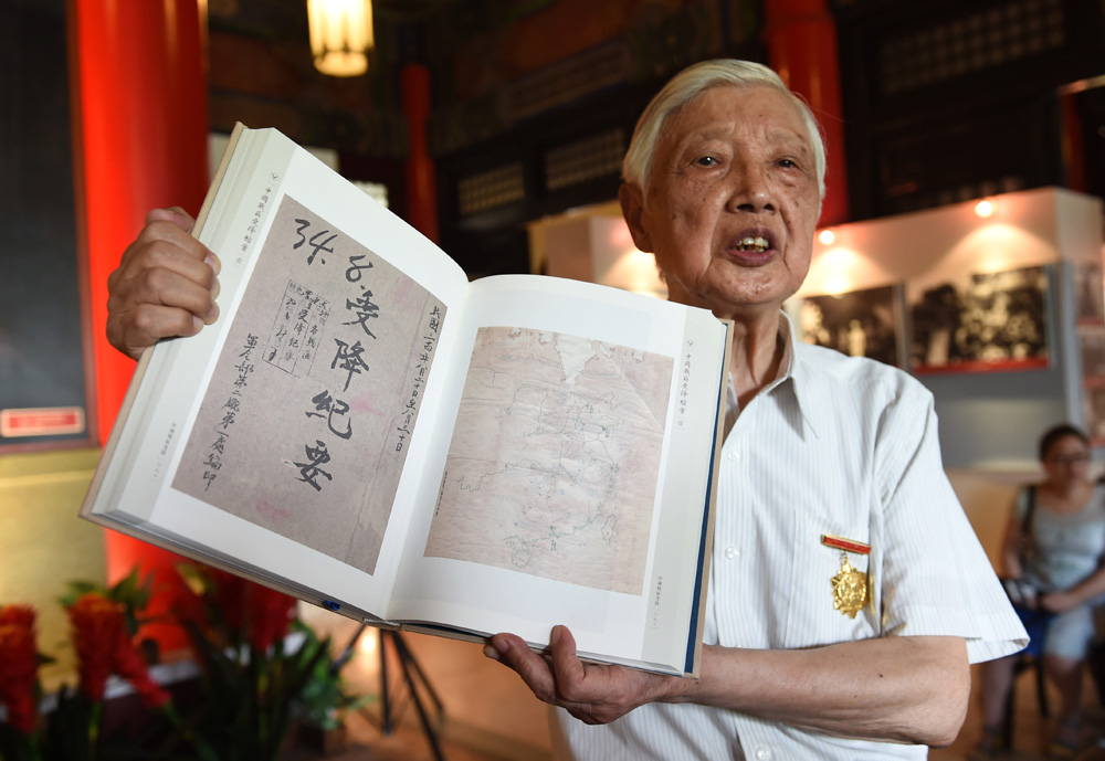 圖:14日,抗戰老兵代表王楚英展示他獲贈的《中國戰區受降檔案》新書/新華社