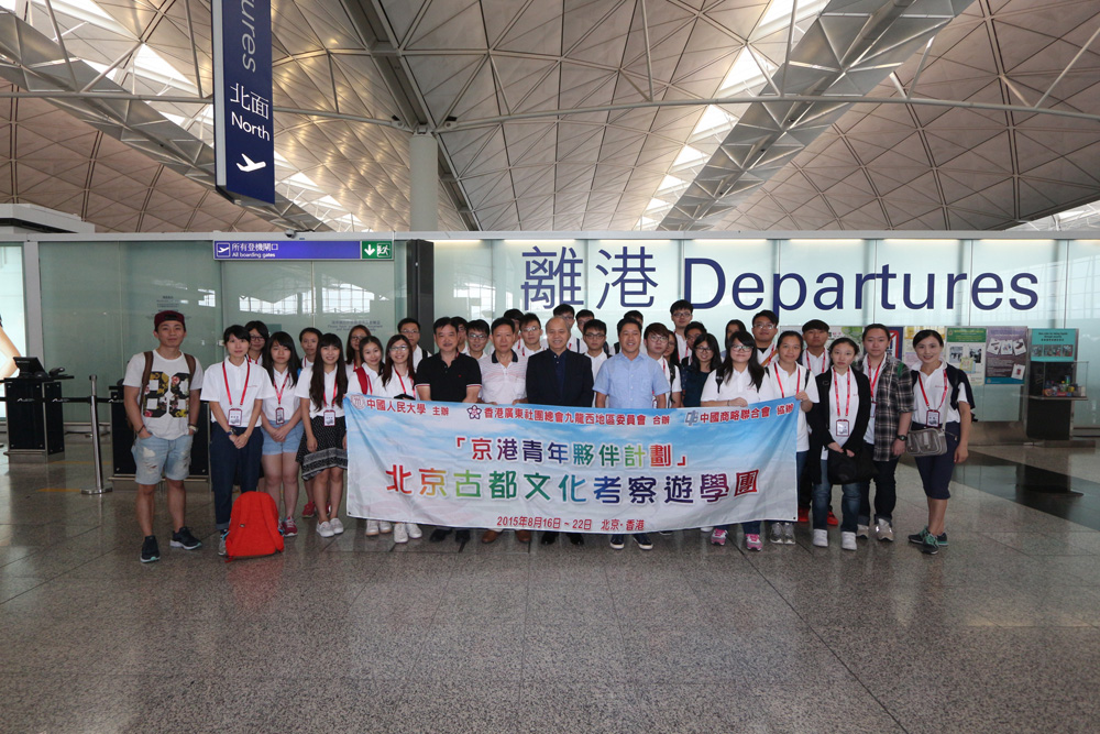 【大公報訊】記者溫寶生報道:由中國人民大學主辦、香港廣東社團總會九龍西地區委員會合辦及中國商略聯合會協辦的「北京古都文化考察遊學團」,約30名香港大、中學生日前(八月十六日)展開為期七天的純學術文化之旅。廣總九龍西地區委員會主席鄧祐才,副主席楊德,副主任陳少洪、區文偉等親到機場為學子送行。鄧祐才勉勵學生切身感受中華文化,加強與內地青年互動交流,要自信、主動、冷靜、自覺,通過不斷的總結、表達以提升自己,面對末來。