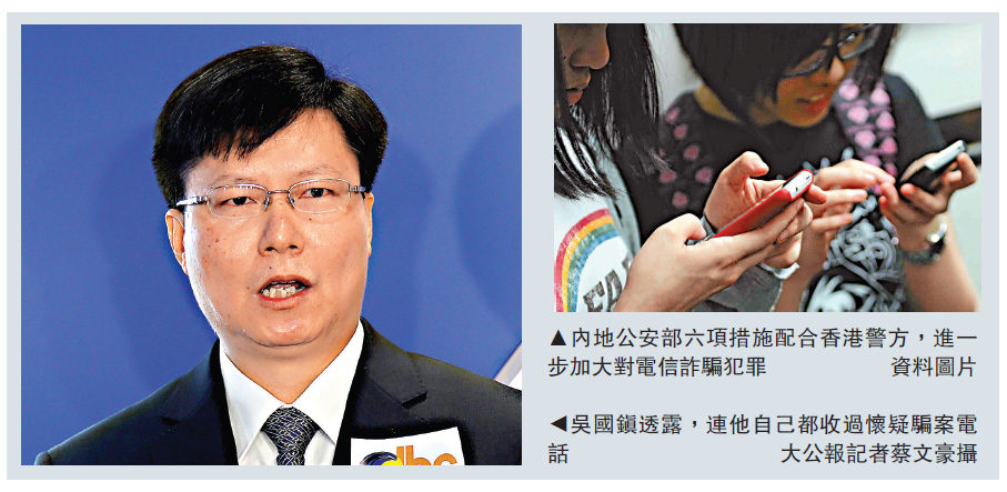 吳國鎮透露,就連他自己都收過懷疑電話騙案的電話,相信騙徒意圖借中央駐港最高機構的名義行騙。他坦言,互聯網發達增加追蹤電話騙案的難度,不法分子「兩頭在外」,即策劃地、組織人員及器材也在境外,有不法分子更以「商務」、「工程」等藉口,誘騙內地人到東南亞國家經商,然後沒收他們護照及聯絡方式,強迫他們打電話行騙。