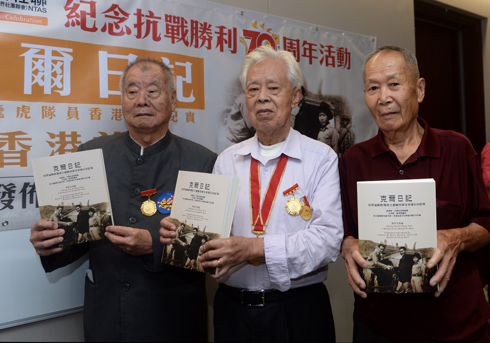 圖:本月5日,《克爾日記》在香港首發,右起、觀音山村民王石,原東江縱隊港九獨立大隊老游擊戰士聯誼會副會長、海上中隊成員羅競輝,原東江縱隊游擊隊員黃立光