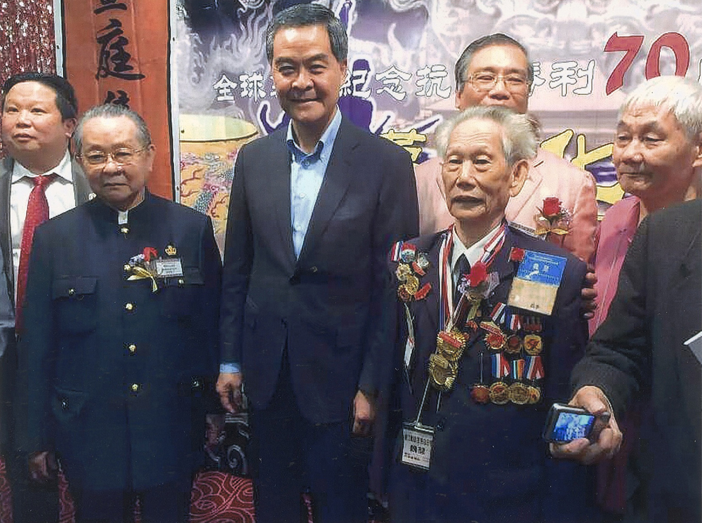 圖:特首梁振英與抗戰老兵魏瑟(右)、婆羅洲大公國國王梁田(左)合照