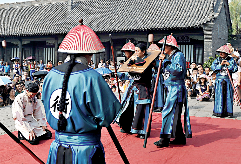 8月20日,山西平遙古城縣衙上演捕頭枉法被縣令緝查的古戲,「縣令」用一句「老虎蒼蠅一起打」結束了當天的審案,吸引了眾多遊客的圍觀。 中新社