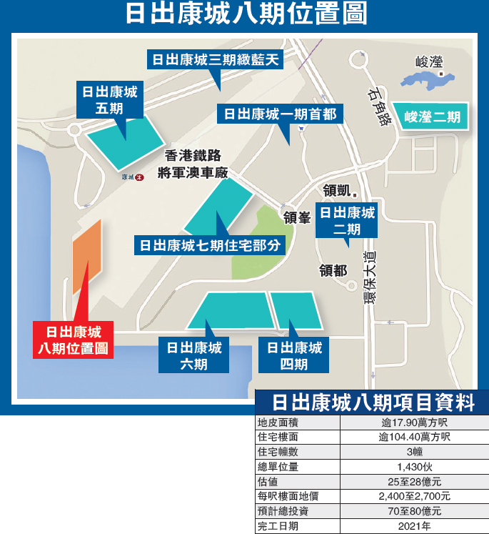 繼上季完成日出康城第七期招標後,港鐵剛宣布,第八期純住宅項目亦開始接受發展商遞交意向書,並於下周三截止。該期涉及三幢約50至55層高住宅大廈,提供最多1430個單位,以可建住宅樓面逾104.4萬方呎計,單位平均面積逾730方呎,明顯偏向中大型單位。項目估計可於九月初正式招標。