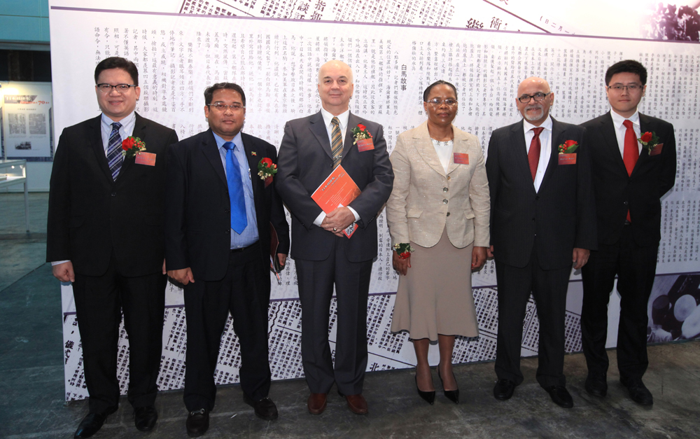圖左起:菲律賓副總領事Christian L. De Jesus、緬甸總領事Zaw Zaw Soe、俄羅斯署理總領事Valentin Markov、南非總領事Phumelele Gwala、巴基斯坦總領事Ghufran Memon和新加坡副總領事Howard Fu出席展覽開幕式後合照