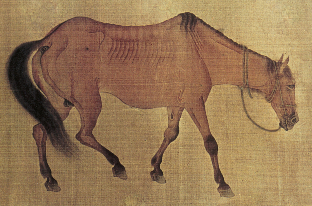 元代畫馬名家,筆者推崇另一高手,為任仁發(月山);最喜愛其《二馬圖卷》,各繪一肥一瘦馬匹。其線條簡練勁健,二者形成強烈對比。肥馬敷花斑桔白二色,骨壯膘滿,曳?昂首,舉蹄欲奔,洋洋得意。瘦馬(見附圖)瘦骨零丁,挽?垂首,疲憊無奈,神氣凋喪。任仁發以隱喻手法,畫馬喻人:瘦馬懷才不得志,肥馬「肥一己而瘠萬民」。