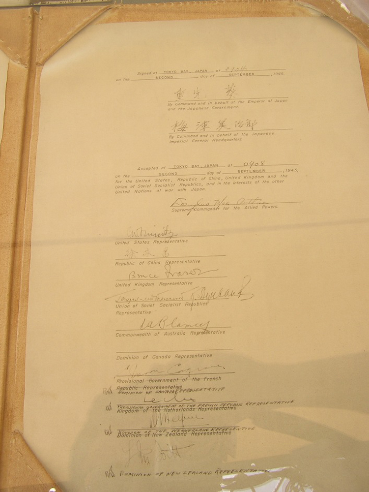 日本在1945年8月15日宣布接受《波茨坦公告》,無條件投降後,於9月3日派出11人代表團,到停泊在東京灣的美國海軍戰艦「密蘇里」號正式簽署投降書。日方代表為外相重光葵及陸軍參謀長梅津美治郎等,而盟國則由盟軍最高司令麥克阿瑟將軍,以及美國、中華民國、英國、蘇聯、澳洲、加拿大、法國、荷蘭及新西蘭9國代表聯合簽署。