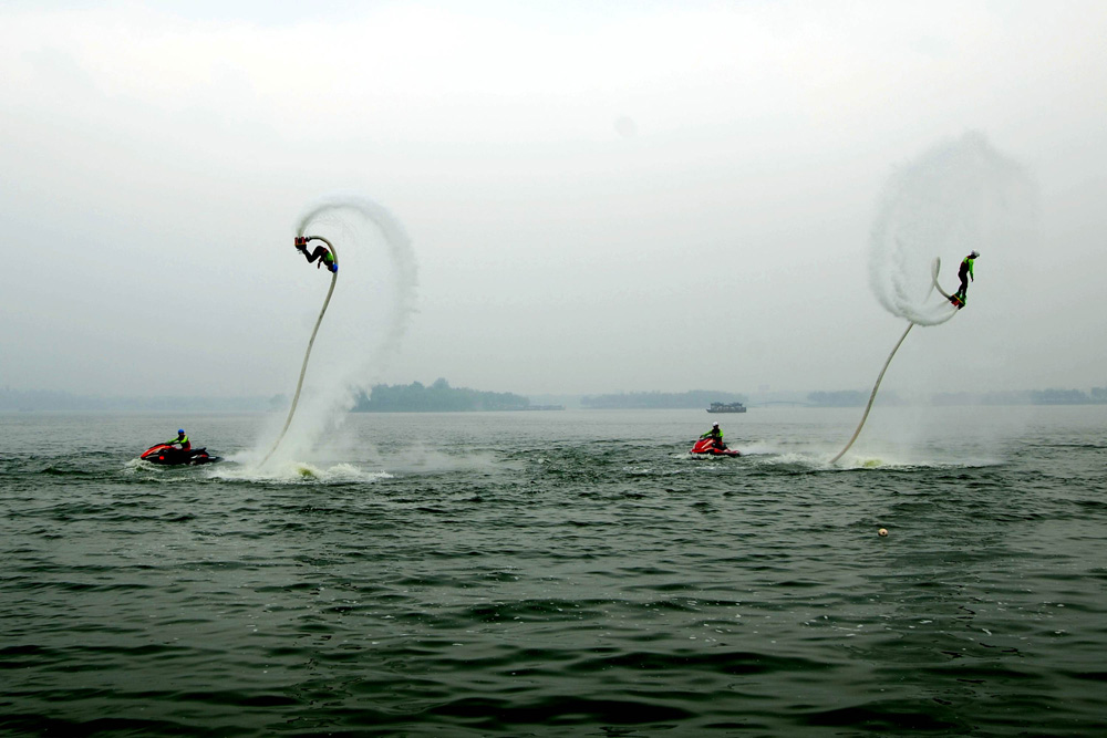 4日,天津市武清區第三屆綠博園迎來水上飛行器表演,微雨中兩組國內頂尖水上飛行器表演運動員,在南湖景區湖面進行單人和多人的飛行器表演,引許多人圍觀。 中新社