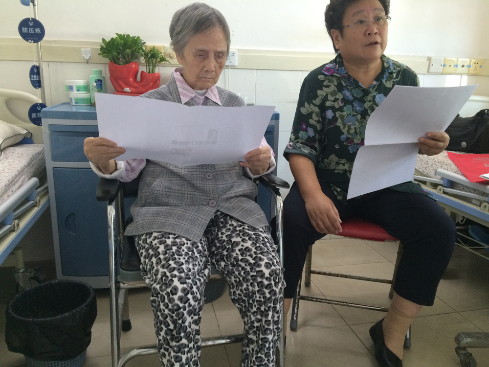 圖:東縱老兵巢湘玲(左)在看材料 大公報記者石華攝