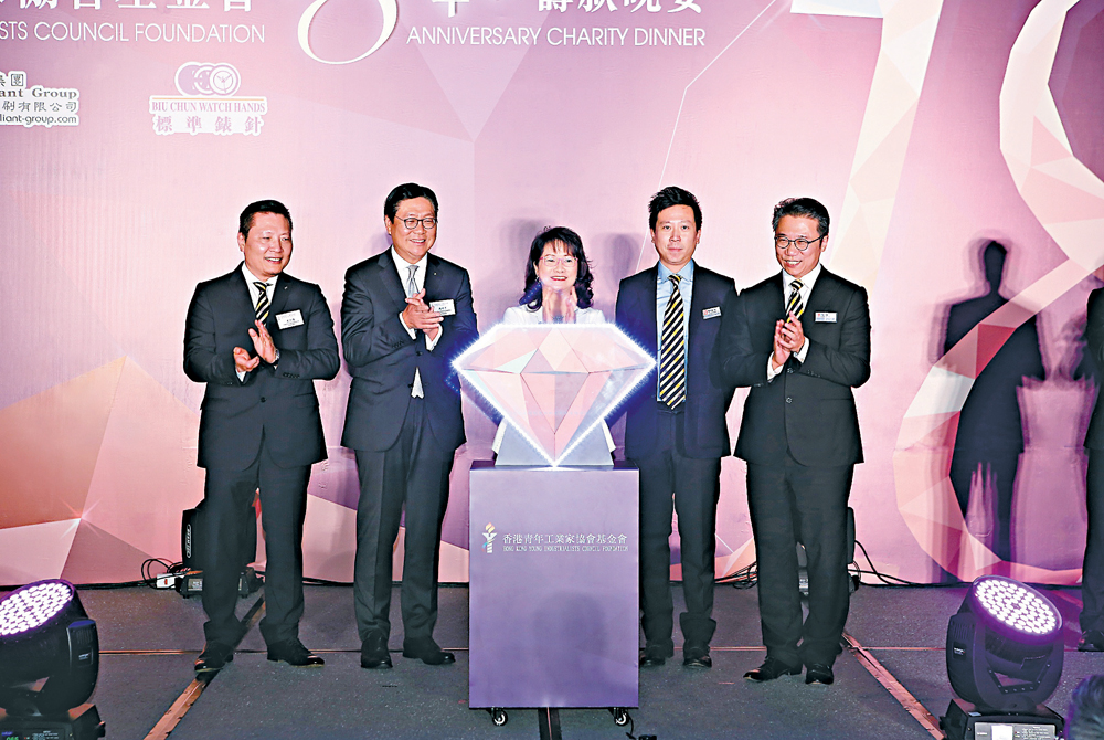 【大公報訊】香港青年工業家協會基金會,日前在唯港薈酒店舉行「香港青年工業家協會基金會18年華籌款晚宴」,晚宴以「興學育才 發放正能量」為主題,香港大學經濟金融學院名譽教授馬時亨教授,基金會會長顏吳餘英、常務副會長史立德,協會會長嚴志明、協會執行委員兼冠名贊助代表理文化工有限公司董事總經理李文恩擔任主禮嘉賓,會員、友好商會及機構的嘉賓超過300人出席。