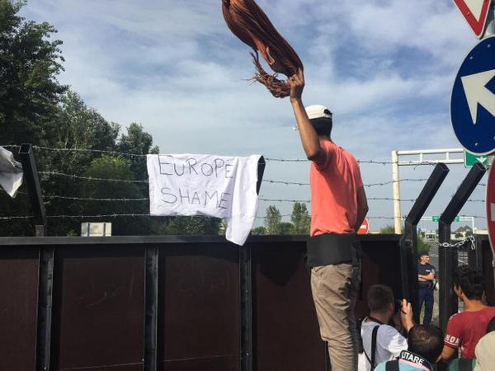 圖:一名難民在匈牙利的鐵絲網上掛上寫有「歐洲可恥」的白衫 互聯網