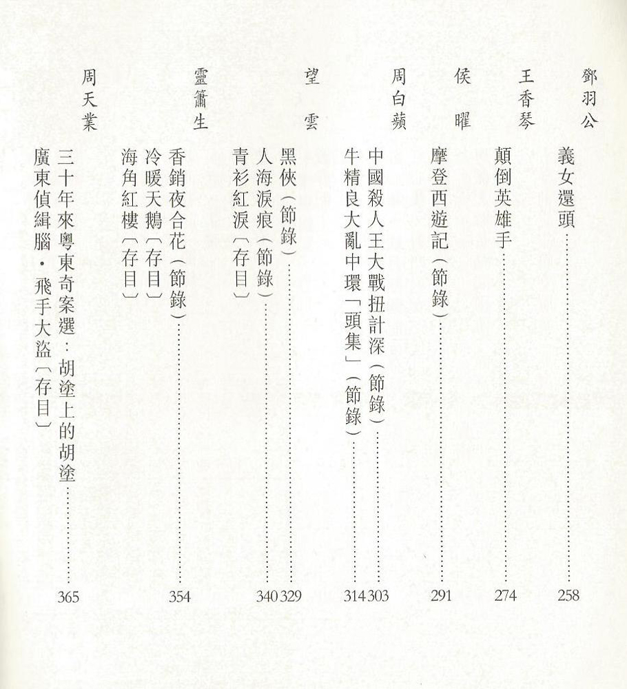 此書最有趣的地方是「節錄」及「存目」的甚多:像齋公的《粵派大師黃飛鴻別傳》、豹翁的《五年前之空箱女屍案》、侯曜的《摩登西遊記》、周白蘋的《中國殺人王大戰扭計深》、望雲的《黑俠》、李我的《慾焰》(即《蕭月白》)、我是山人的《三德和尚三探西禪寺》、高雄的《經紀日記》……等都是節錄,共十七種;而孫受匡的《熱血痕說集》、何恭第的《玉面狐狸》、黃言情的《老婆奴》、黃天石的《紅心集.缺月團圓記》、靈簫生的《海角紅樓》、怡紅生的《秘密生涯》……等則是存目,亦有十一種之多。