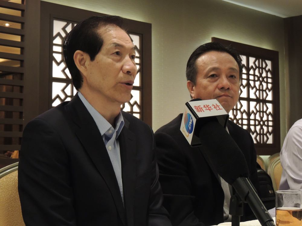 圖:本港將在下月5日舉行紀念抗戰勝利暨台灣光復70周年大會。盧文端(左)和姚志勝介紹紀念大會情況 大公報記者陳璁攝