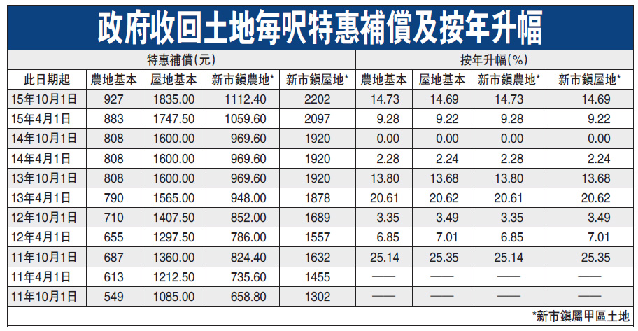 【大公報訊】記者林志光報道:近期本港樓價雖似有回調跡象,但政府的收地補償費用卻不斷上調,最新對於農地及屋地的每方呎特惠補償金,半年間再升約5%;而按年升幅更接近15%,幅度為五年最大。