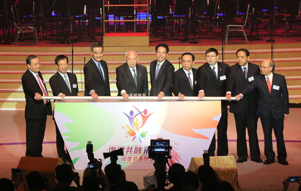 圖:董建華(左四)、梁振英(左三)、張曉明(左五)、宋如安(右三)、孫文舉(右二)、鄭耀棠(左二)、岑濬(右四)、杜偉強(右一)和岑少雄(左一)一同為晚會主持啟動儀式」大公報記者黃洋港攝