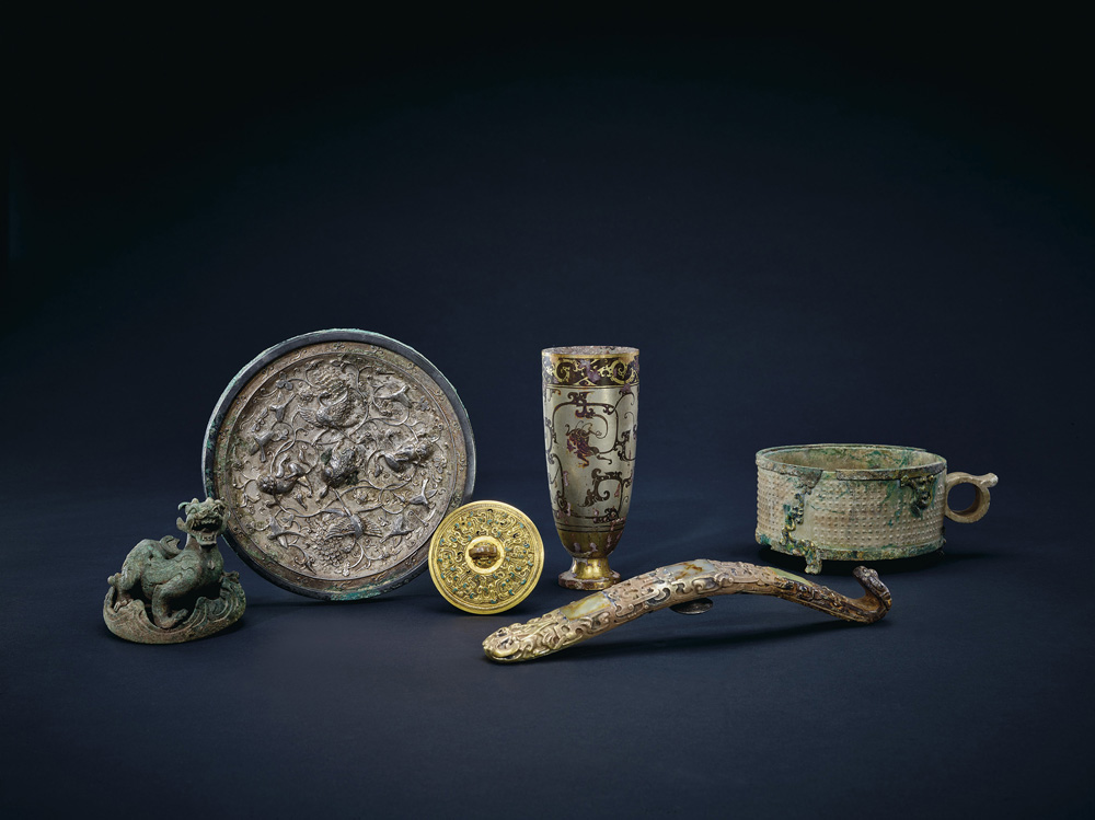 圖:「見微知著─奉文堂吉金」部分藏品,左起第一件為春秋青銅辟邪席鎮,後排右起第二件為漢代青銅烙銀瑞獸紋杯