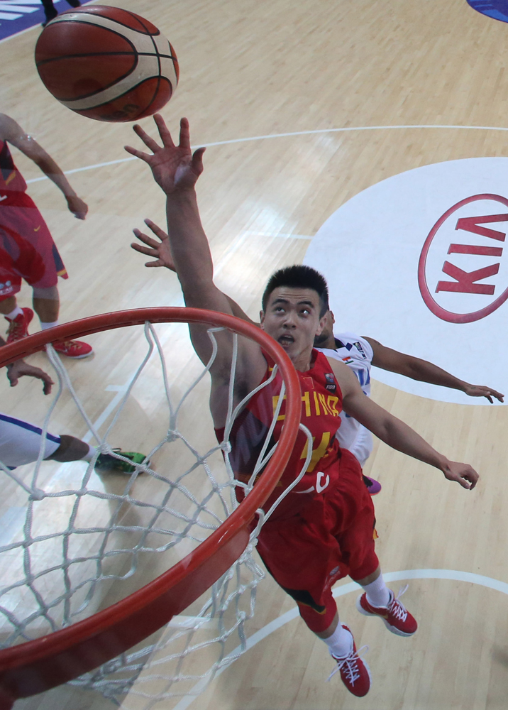 圖:這是中國男籃球員趙繼偉(前)在亞錦賽對印度的比賽中上籃的資料圖片\新華社