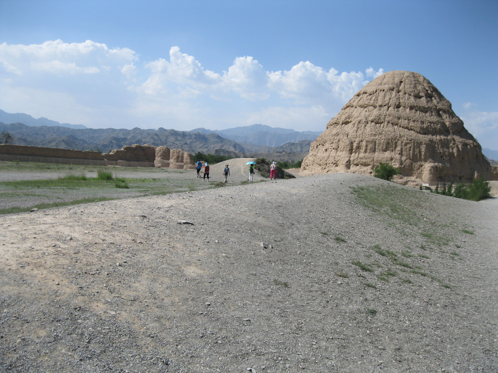 二○一五年八月二十七日,黃昏,從香港飛成都,抵達有「蜀犬吠日」之稱少見陽光多見雲霧的古都成都時,已是晚上八時許。再坐車走一段路,進餐廳,匆忙吃點晚餐後,入住酒店。睡不到四個小時,翌晨四時半起床,又飛寧夏回族自治區的銀川。睡眼惺忪,上午所遊景點已了無多大心思細看,午間一時許,來到距銀川城區三十五公里西郊的西夏王陵,才被那巍峨壯觀的賀蘭山,以及山下形制獨特、氣勢宏大的西夏王陵所吸引,倦意全消。在那方圓五十多平方公里的土地上,分布?九座王陵和二百五十三座王公貴戚的陪葬墓,這是被譽為「東方金字塔」的西夏王陵。