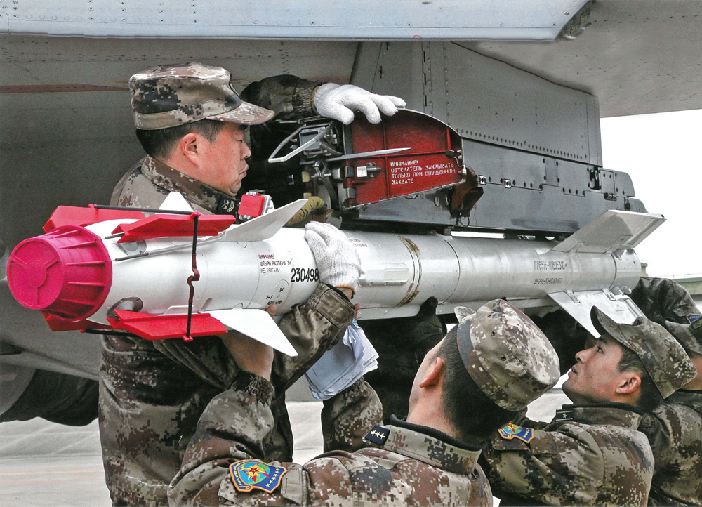 圖:航空兵為戰鬥機安裝格鬥導彈/資料圖片