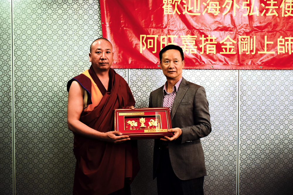 圖:副會長林杉(右)代表同鄉會致送紀念品予阿旺嘉措金剛上師