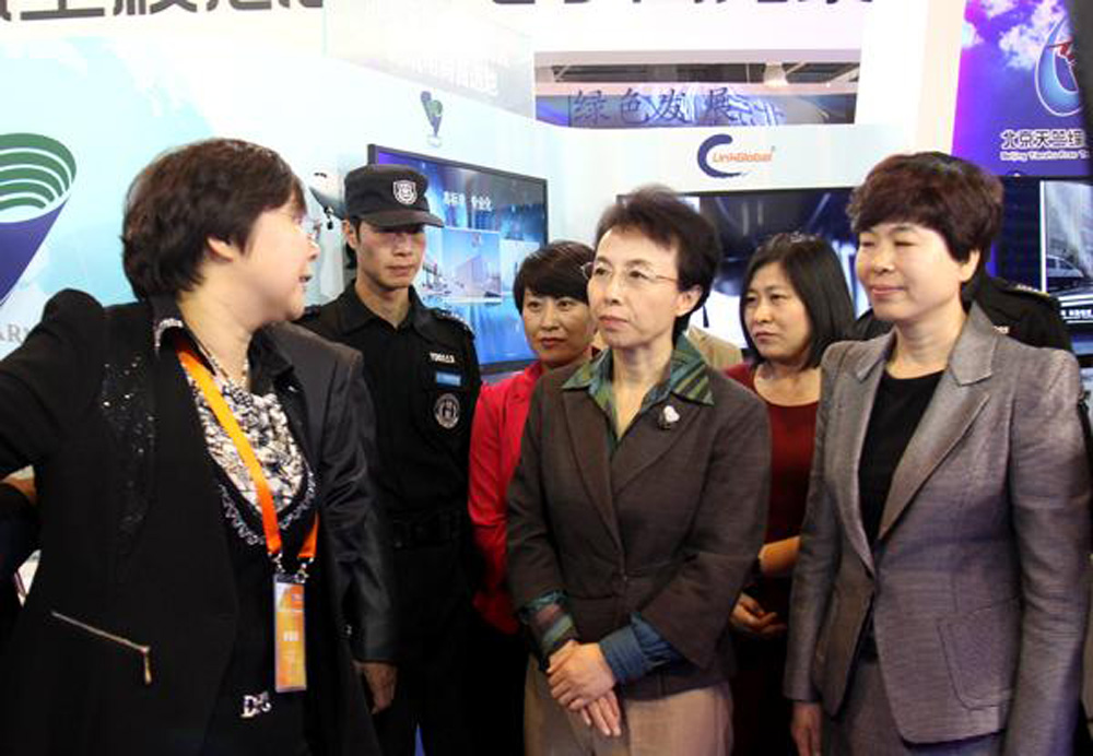 圖:12日,2015中國(北京)電子商務大會在京開幕,北京市副市長程紅(前排右二)參觀北京順義展區/網絡圖片