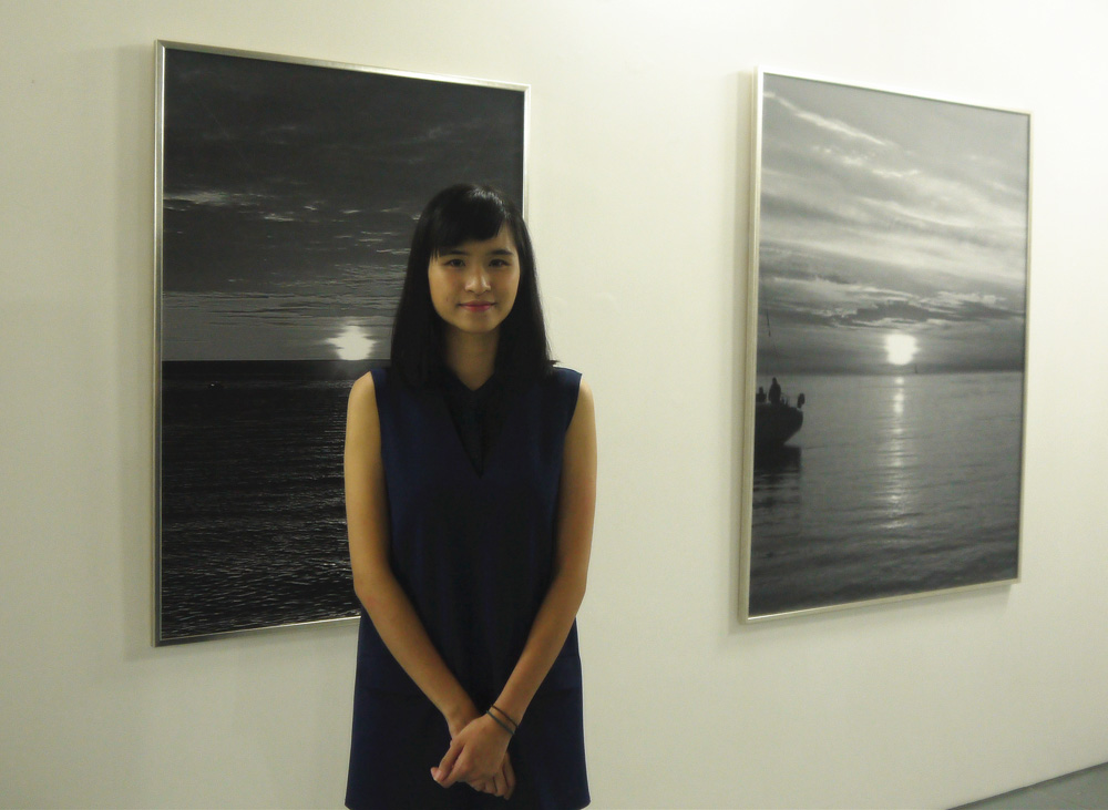 圖:藝術家高倩彤,其身後左側為作品《太陽不在這裡(之八)》,右側為《太陽不在這裡(之二)》/大公報記者周婉京攝