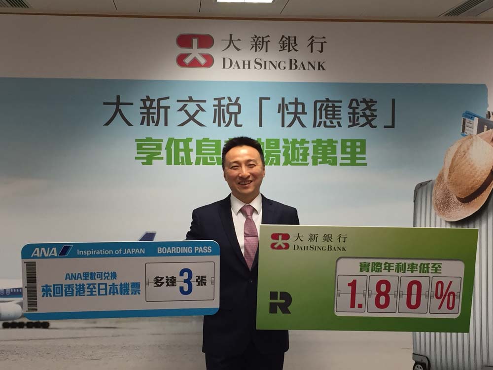 大新銀行(02356)昨日亦加入稅貸戰團。大新銀行銀行產品部總經理及主管鄧子健表示,今年該行的稅貸計劃分別推出「清水版」及「高增值版」。「清水版」為12個月還款期,息率較低,但不設飛行里數回贈,100萬元以上特惠客戶的貸款年息為1.8%,一般客戶則為2.14%。至於「高增值版」還款期為24個月,息率雖然較「清水版」為高,100萬元以上特惠客戶的貸款年息為2.34%,一般客戶則為2.68%,但同時申請ANA香港白金Visa卡及出糧服務,最多可得到51000 ANA里數,相當於香港至日本來回經濟客位機票三張。