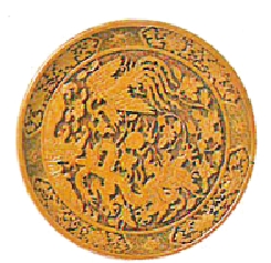 像附圖,乃嘉慶元年(公元一五二二年)所製剔黃(兼剔紅)龍鳳紋漆盤,色調較純剔棗紅色調淡雅,但不失纖麗華美。傳統的「剔紅」,使用紅漆髹塗若干層,才於漆上雕刻花紋。剔,乃「去掉」之意;即在紅漆層去掉不要的部分,顯出圖紋來。若髹塗黃漆,然後雕刻,則稱「剔黃」。後來隆慶時期,名雕漆匠黃成所著《髹飾錄》,便指出「剔黃,制如剔紅,而通黃」。那時,又有「剔綠」、「剔黑」和「剔彩」(髹不同顏色數種漆),其理相通。