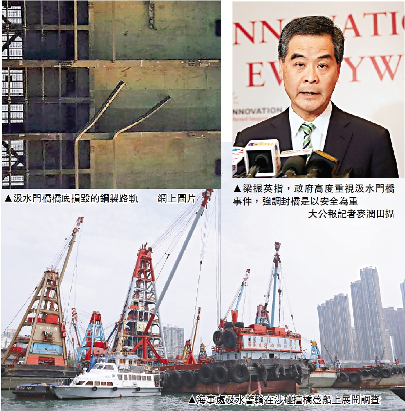 梁振英下午出席公開活動表示,政府正對涉事船隻進行檢驗,以確定責任問題。對於部門被指事發後應變混亂,他強調,政府一定要以安全為重,不能冒任何風險,不知道橋的結構和安全性有否受影響前,不能容許汽車及鐵路繼續用橋,因此確有需要封橋,部門已第一時間派人檢查橋的受損情況。他指出,前晚因事故趕不上航班的乘客人數少於100人,港鐵、大橋管理公司、機場管理局等單位已根據既定應變計劃,盡量縮短封橋的時間,減少對使用者造成的不便。
