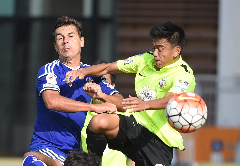 圖:東方中場迪高(左)與駿其球員謝朗軒力爭皮球」大公報記者李恆基攝