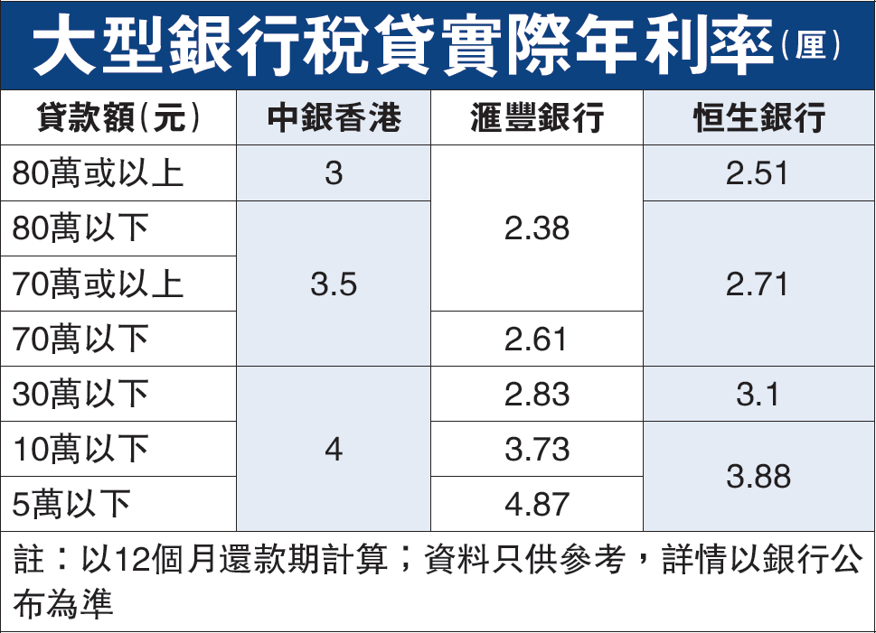 中銀香港旗下的南洋商業銀行,日前公布「交稅貸輕鬆」貸款計劃,適用於所有客戶的貸款實際年利率,30萬以下為4厘,30萬或以上則為3.5厘。若於明年三月底之前選用「南商理財」綜合理財帳戶及發薪服務,並符合指定要求,實際年利率可低至1.5厘。