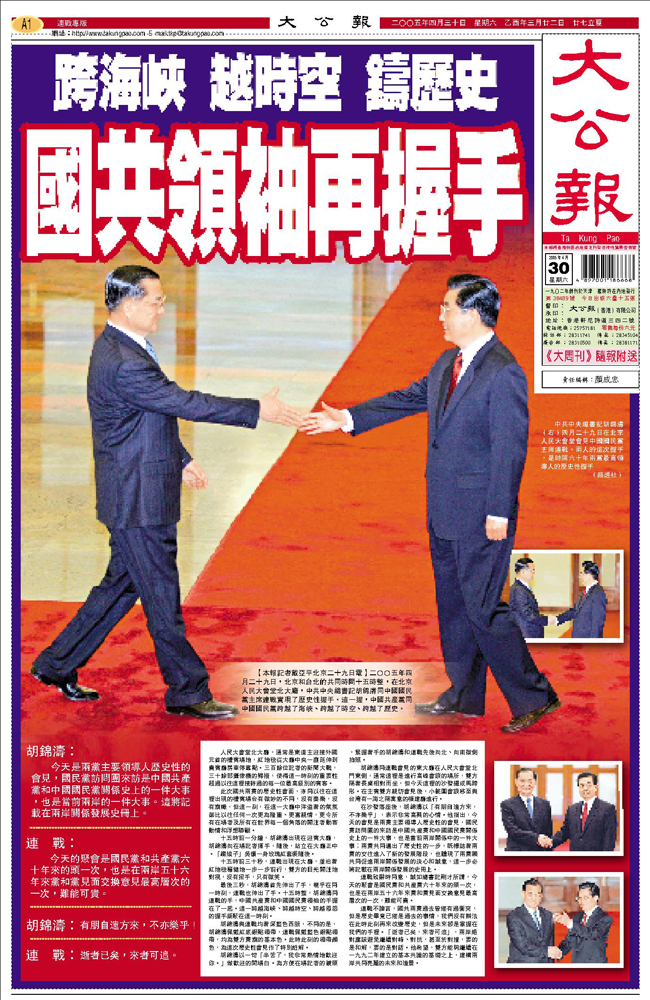 圖:二○○五年四月三十日,大公報頭版報道中國共產黨總書記胡錦濤與中國國民黨主席連戰跨越六十年的握手