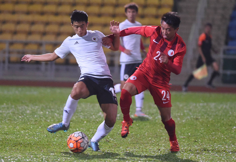 圖:香港B隊中場劉浩霖(右)與飛馬黃俊皓爭搶/大公報記者李恆基攝
