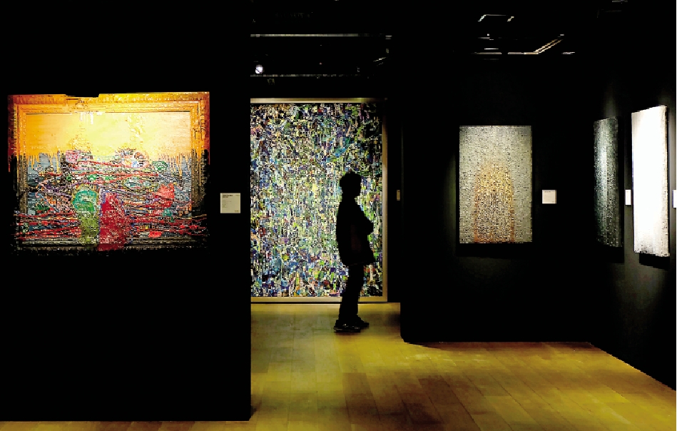 圖:展廳一隅集中陳列菲律賓籍畫家的作品。左為「八○後」藝術家吉格.克魯斯今年新作《橙頻率橙》;後中為已故女畫家帕西妲.阿巴德二○○三年作品《塞納河畔馬爾奈》;右側三幅為劉安民畫作/大公報記者黃璇攝