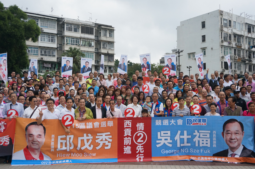 民建聯一直堅持扎根社區,不少區議員都已為社區服務超過二十年,當中包括西貢市中心候選人吳仕福及白沙灣候選人邱戊秀。為獲得連任,西貢市中心候選人吳仕福及白沙灣候選人邱戊秀的兩百多名支持者齊到西貢天后廟廣場,並不斷高呼「西貢前行.情『2』先行」等口號,為他們競選助威。昨日亦到場支持的李慧?及葛珮帆都表示,此次區議會選舉「一票也不能少」,希望支持者在22日踴躍投票,將正能量及理性聲音帶入議會。