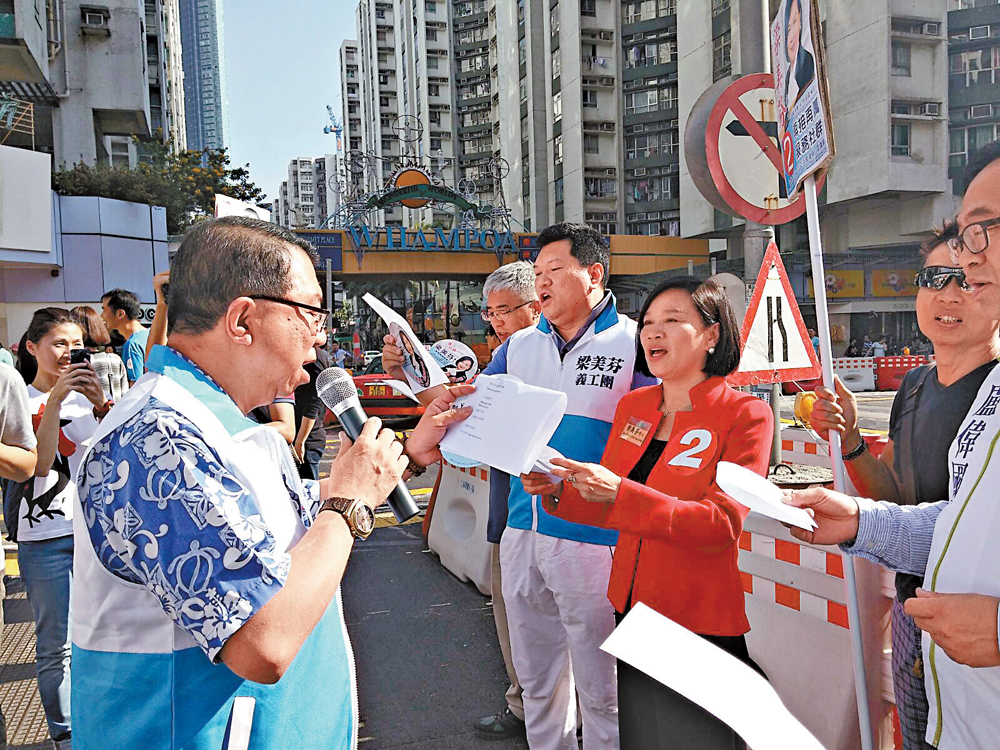 【大公報訊】記者龔學鳴報道:兒科醫生李家仁向來熱衷時事,昨日區議會選舉日亦「落手落腳參與」,將其曾一炮而紅的兒歌《小明上廣州》,改編成《小明撐美芬》,支持爭取在九龍城黃埔東選區連任的經民聯「雙料」議員梁美芬,並和經民聯立法會議員盧偉國、中澳法學交流基金會主席馬恩國一起在街頭大合唱。