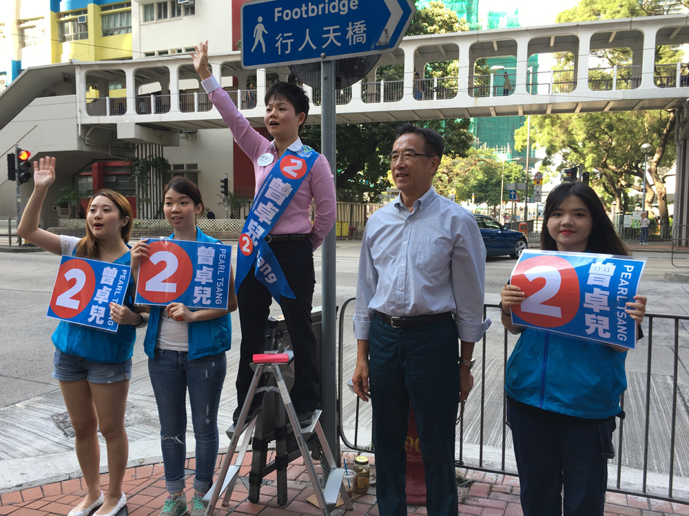 圖:田北俊(右)到北角支持丹拿選區候選人曾卓兒(中) 大公報記者楊致珩攝