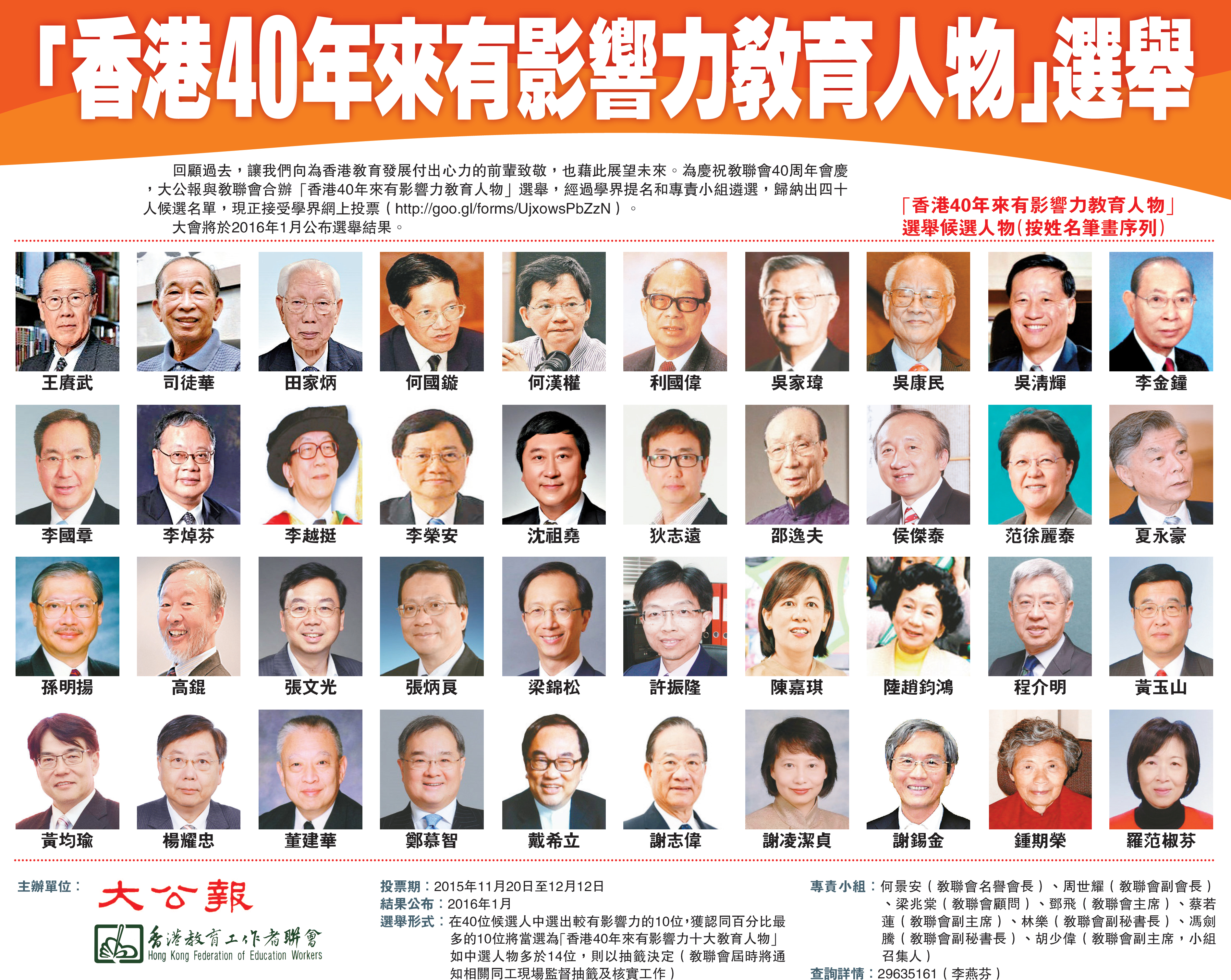 回顧過去,讓我們向為香港教育發展付出心力的前輩致敬,也藉此展望未來。為慶祝教聯會40周年會慶,大公報與教聯會合辦「香港40年來有影響力教育人物」選舉,經過學界提名和專責小組遴選,歸納出四十人候選名單,現正接受學界網上投票(http://goo.gl/forms/UjxowsPbZzN)。